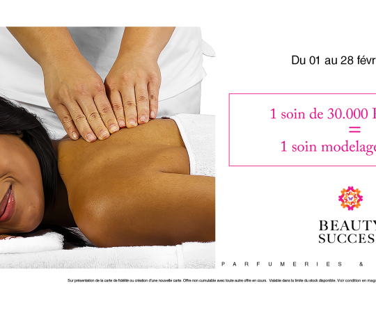 Rendez-vous dans nos instituts de beauté Beauty Success Marcory et Palmeraie pour un véritable moment de bien-être : épilation, soins du visage, soins du corps… et pour tout soin acheté de 30.000FCFA minimum, UN SOIN MODELAGE VOUS EST OFFERT !!!