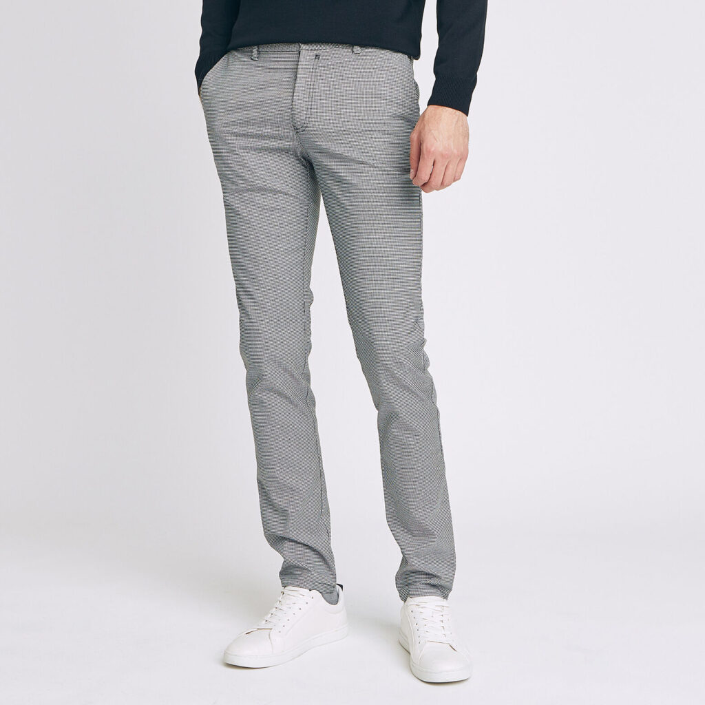 Cette saison encore, le chino homme se renouvelle avec un motif pied de puce graphique et intemporel sur une coupe slim élégante et actuelle.