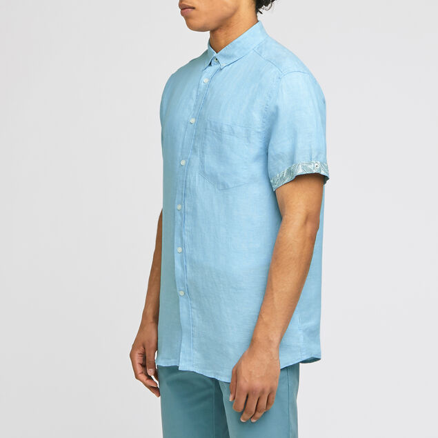 Cette chemise unie regular à manches courtes, en fibres de lin françaises certifiées, possède un col français, une poche poitrine et des détails manches contrastés.