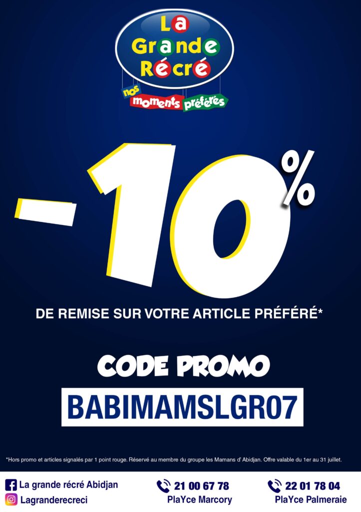 Offre valable pour les mamans du Groupe: les mamans d’Abidjan, jusqu’au 31 juillet. Sur présentation de ce coupon. Hors promo en cours.