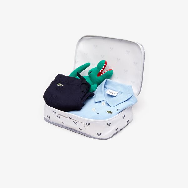 Cet ensemble est composé d’un polo et et d’un pantalon en piqué reliefé uni. Ce cadeau parfait présenté dans une jolie valisette en tissu imprimé est accompagné d’une iconique peluche crocodile.