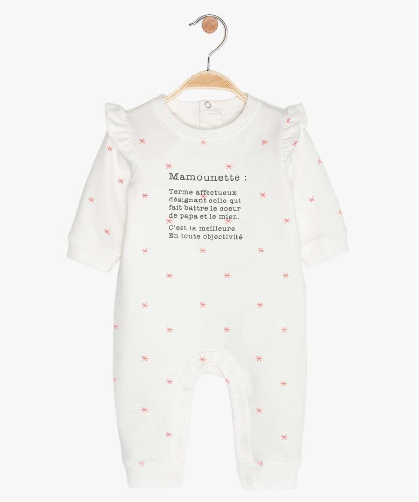 Combinaison pyjama sans pieds pour bébé, à porter la nuit avec des chaussettes douillettes ou le jour comme tenue hyper confortable. Au quotidien, le pyjamaest aussi pratique, grâce à son entrejambe pressionné qui facilite le change. La combinaison s’enfile facilement grâce à 3 boutons-pression en haut du dos. On est sous le charme du motif étoile fluo, de l’inscription adorable sur l’avant et des petits volants aux emmanchures pour une note girly. Finition biais aux poignets, aux chevilles et au col.