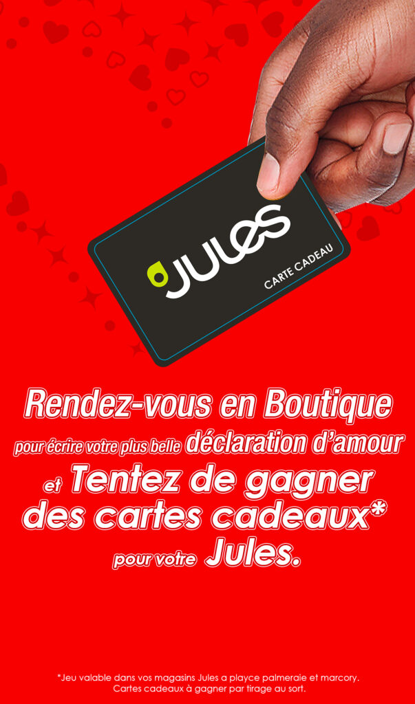 Rendez vous dans l’une de vos boutiques Jules, chez PlaYce Palmeraie ou PlaYce Marcory, écrivez-nous votre plus belle déclaration d’amour sur un tableau prévu à cet effet et tentez de gagner des cartes cadeaux Jules!