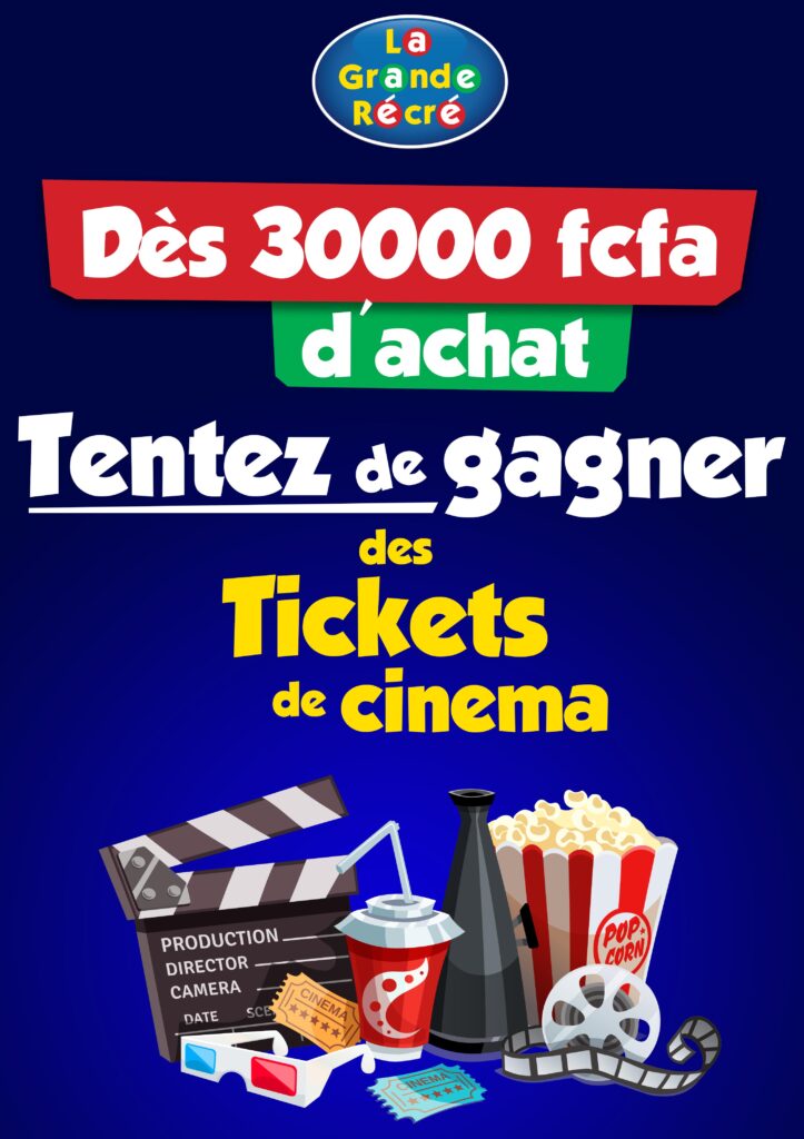 Actuellement dans votre boutique la Grande Récré chez PlaYce Marcory, dès 30.000FCFA d’achats, vous pouvez repartir avec des tickets de Cinéma.
