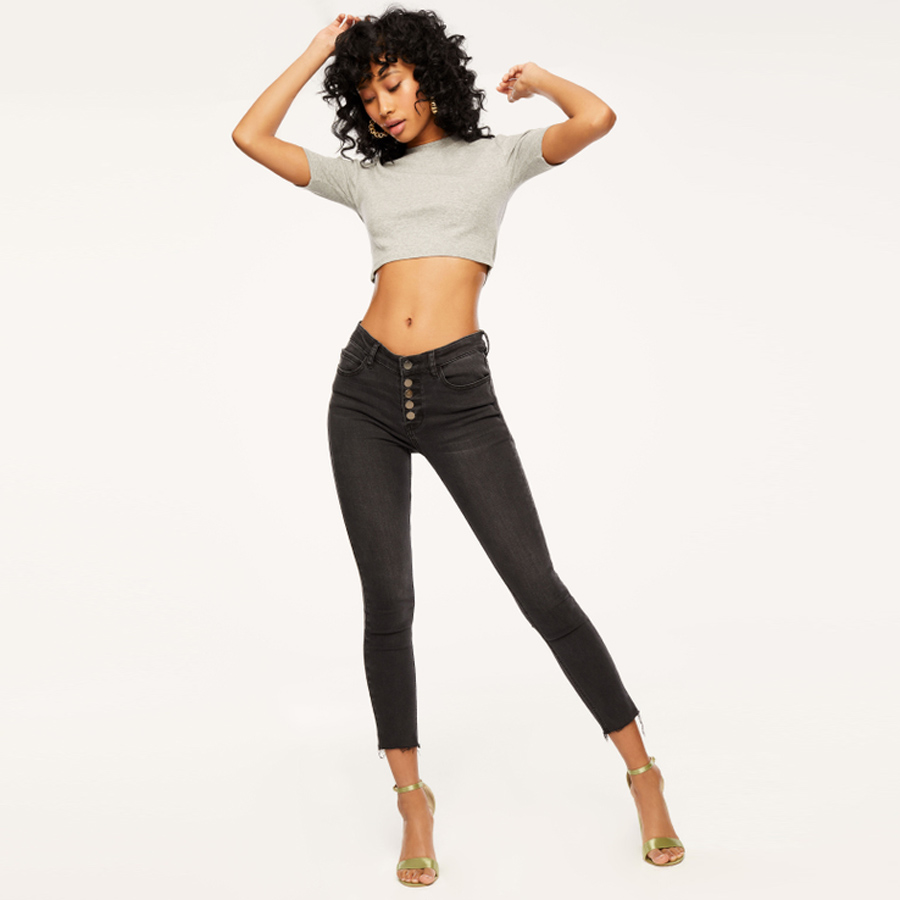 Pantalon jean taille haute noir, tissu extensible, coupe skinny, fermeture bouton à l’avant. Lokk décontracté