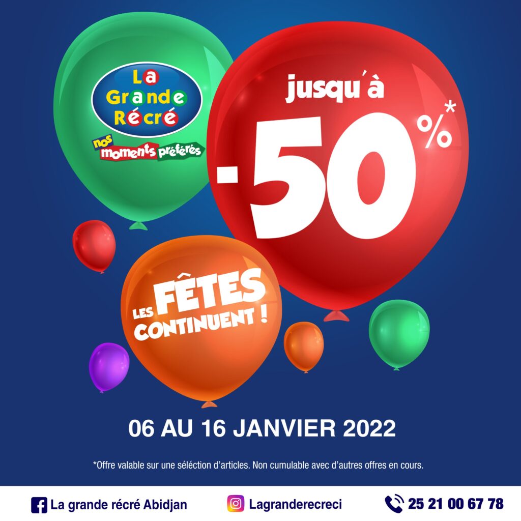 OFFRES EXCEPTIONNELLES dans votre boutique LA GRANDE RECRE de PlaYce Marcory. Jusqu’à -50% sur une sélection d’articles du 06 au 16 Janvier 2022.