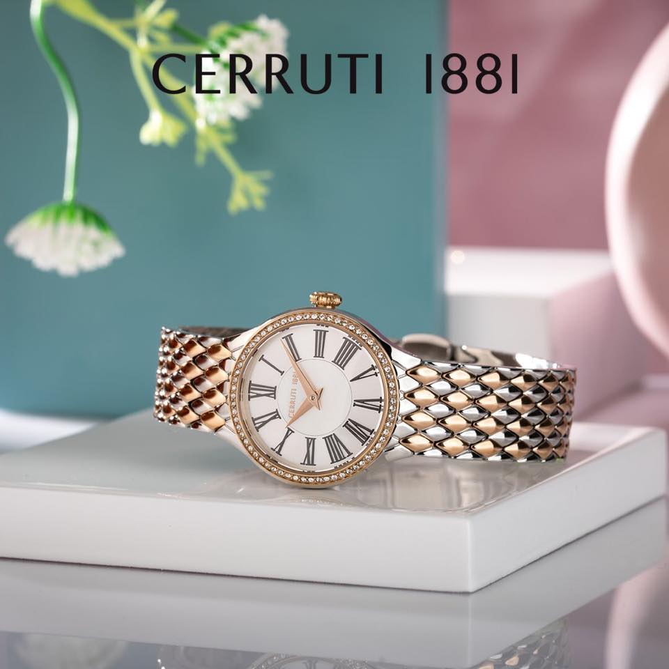 Montre analogique pour femme , Cerruti 1881, en acier inoxydable bicolore, cadran serti de cristaux de Swarovski, Garantie internationale de 2 ans .