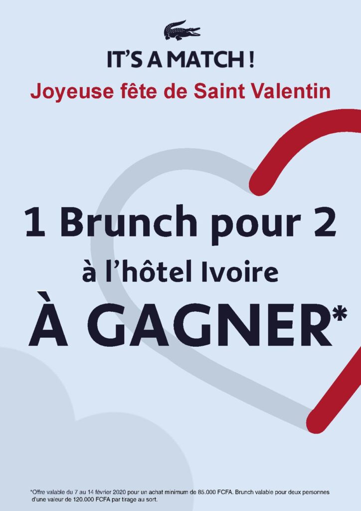 **Offre valable du 7 au 14 Février 2020. Participation au tirage au sort dès l’achat minimum de 85 000F en une seule fois chez Lacoste – Ccial PlaYce Marcory à Abidjan et après avoir rempli le bordereau de participation à la tombola St Valentin Lacoste.