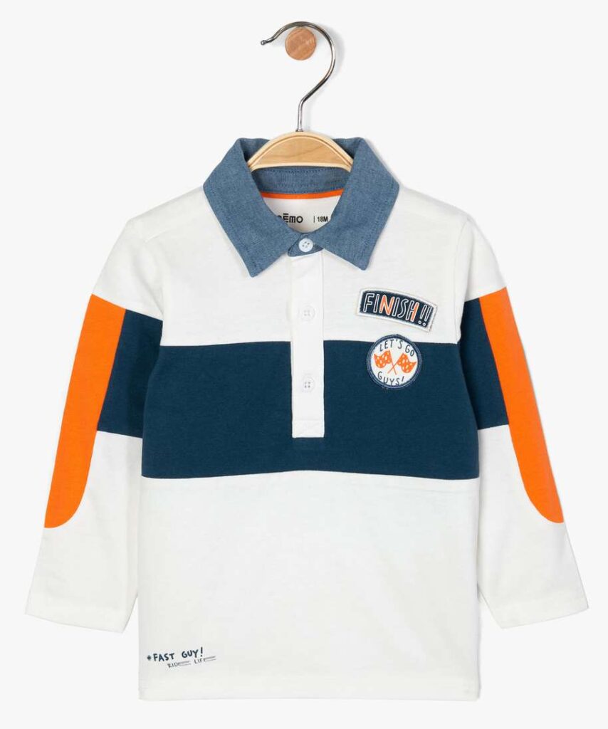 Pour une allure sportswear et gaie à la fois, on opte sans hésiter pour ce polo bébé garçon ! Un polo à manches longues qui trouvera sa place en toutes saisons dans le vestiaire de votre bambin. On aime l’allure chic de son col en chambray qui contraste avec les jeux de couleurs franches. Sur la poitrine, deux patchs apportent un joli relief au polo. Un tee-shirt multicolore à porter avec un jean comme avec un jogger ou un chino.