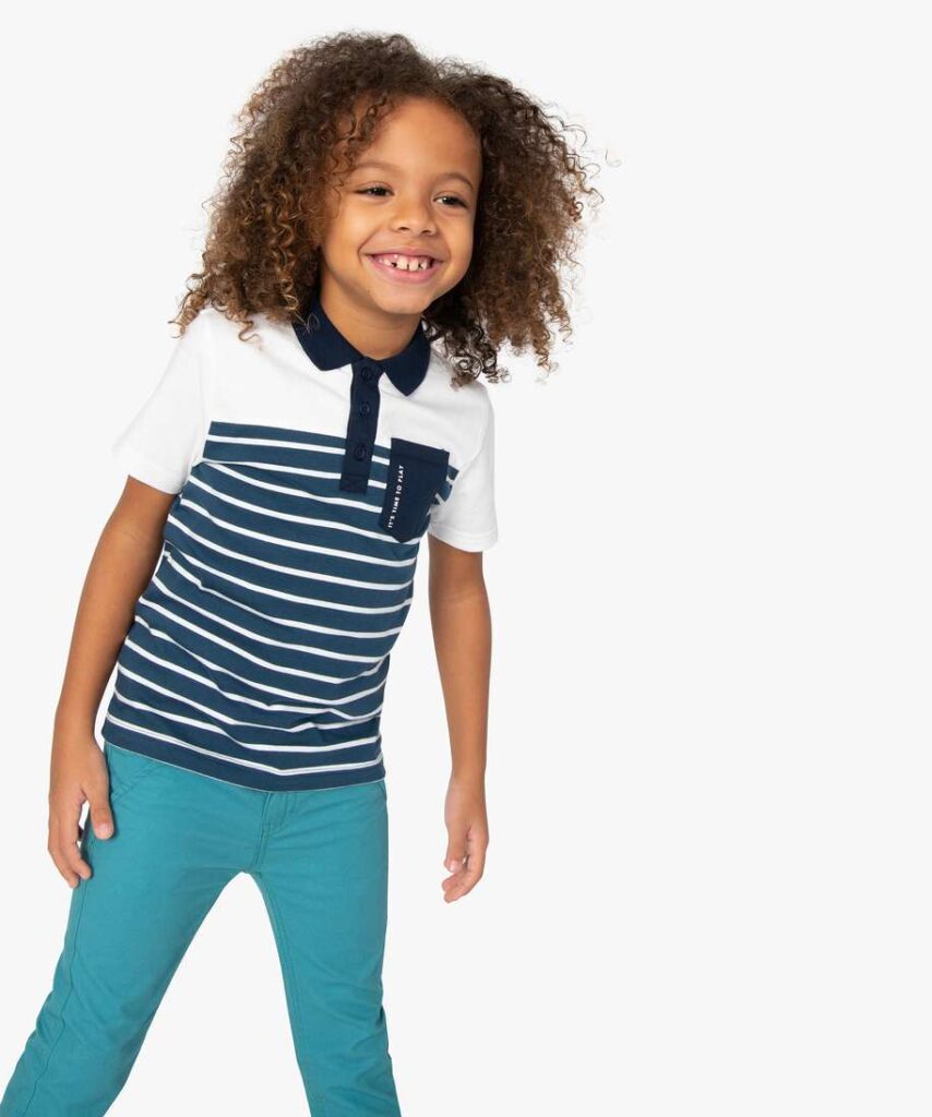 Pour un look sportif mais néanmoins élégant, les petits garçons adopteront ce polo à rayures avec un empiècement uni sur le haut du buste. Ce polo garçonpossède un col et poche poitrine au coloris contrastant pour encore plus de style. Il se ferme par trois petits boutons ton sur ton. Un polo à manches courtes à porter avec un bermuda et une paire de chaussures bateau.
