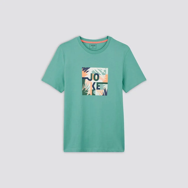 Ce tee shirt à manches courtes imprimé feuillage coloré avec mot possède un col rond et une coupe slim, pour un porté près du corps. Ce tee-shirt se porte facilement avec un jean, un chino, un bermuda ou un short. Disponible dans vos boutiques Jules Marcory et Jules Palmeraie à 9500 FCFA